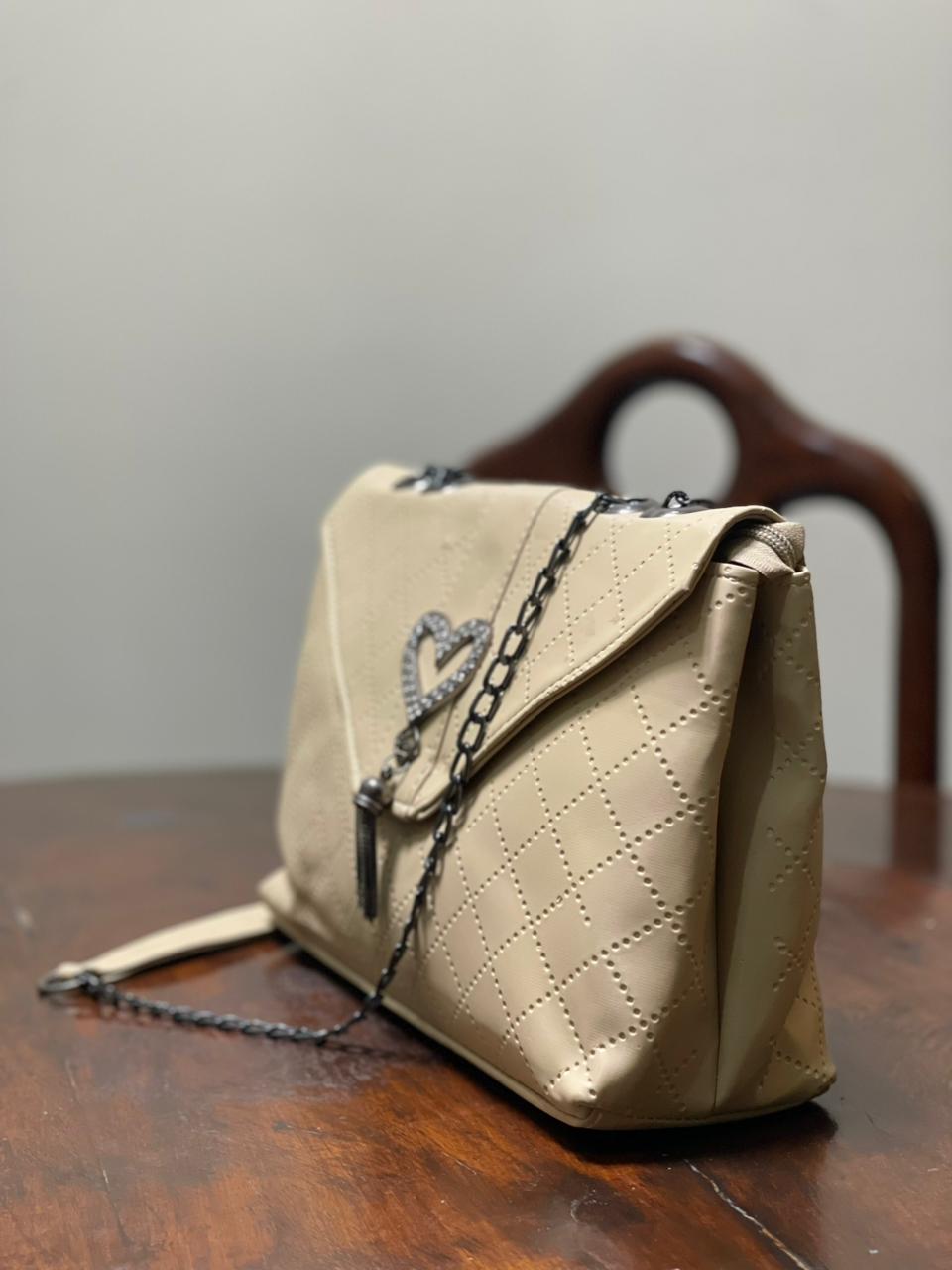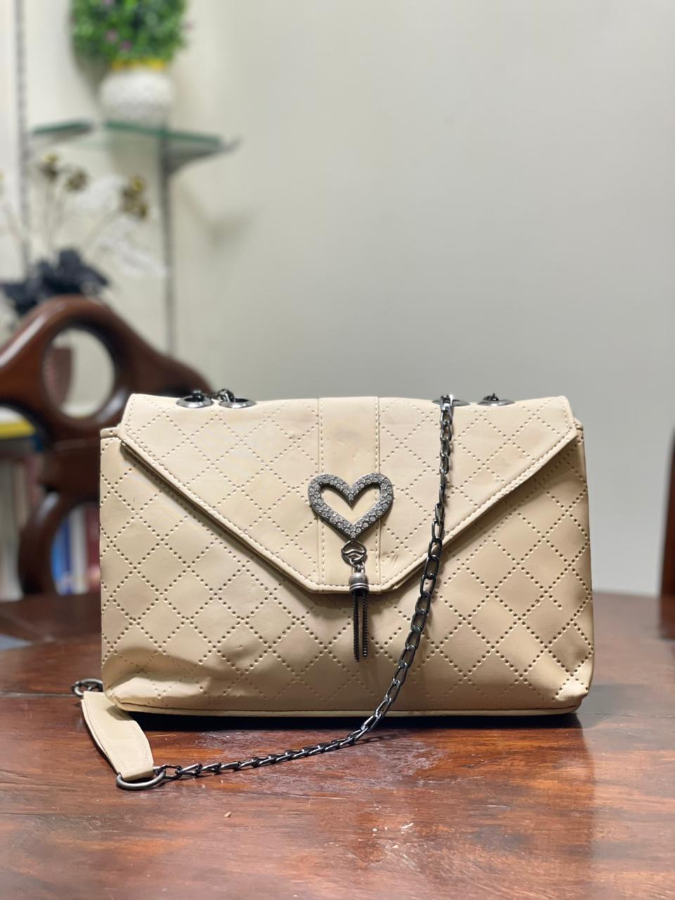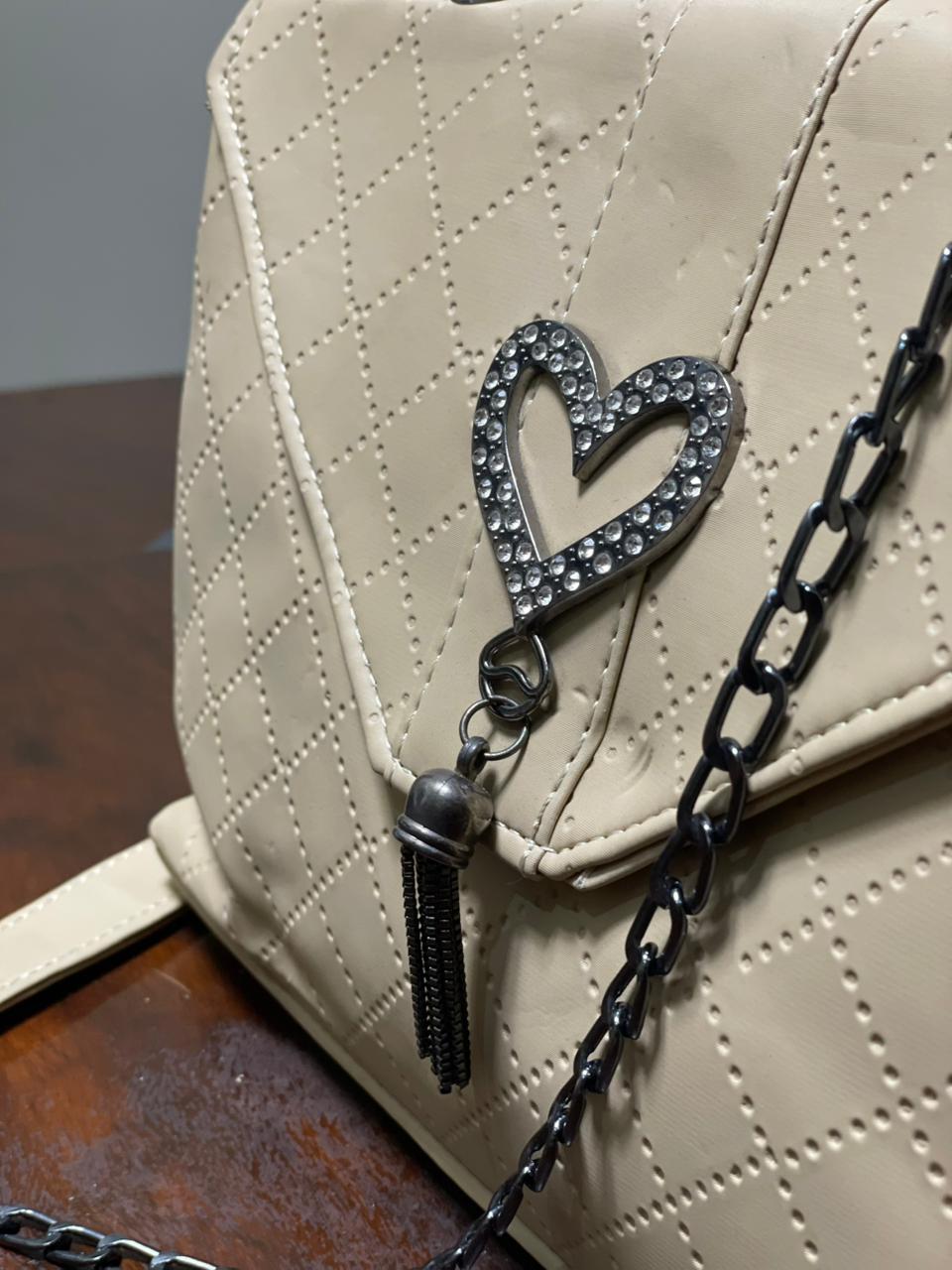 The bag is finished with a sleek chain strap that allows comfortable shoulder or crossbody wear, blending style with practicality. A charming heart-shaped accessory adds a playful, feminine accent, making this piece both stylish and distinctive.