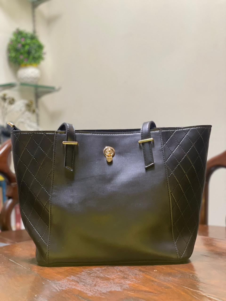 Upgrade your accessory collection with this black faux leather tote bag, designed to combine sleek sophistication with an edgy statement detail. Crafted from high-quality faux leather, the bag features quilted side panels that add texture and visual interest, while maintaining a clean, structured silhouette.