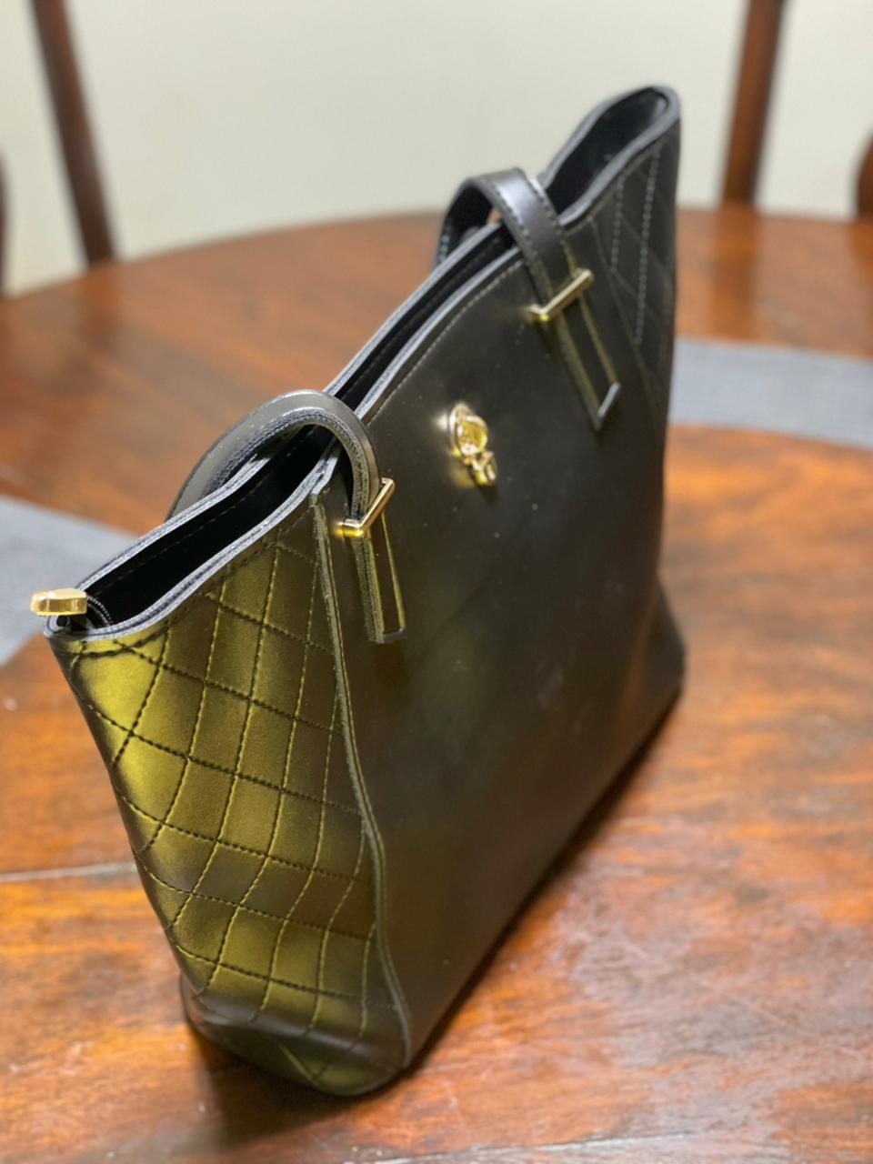 The standout gold-tone skull embellishment on the front introduces a bold, fashion-forward element that elevates the overall look. Spacious and practical, this tote is ideal for carrying everyday essentials — from your wallet and phone to cosmetics and small personal items — making it perfect for work, shopping, or casual outings.
