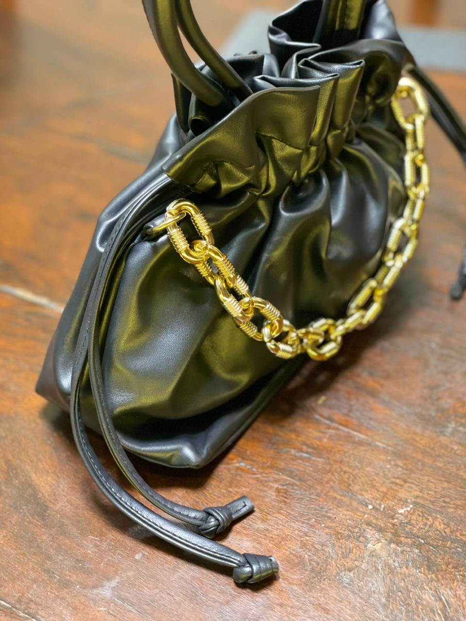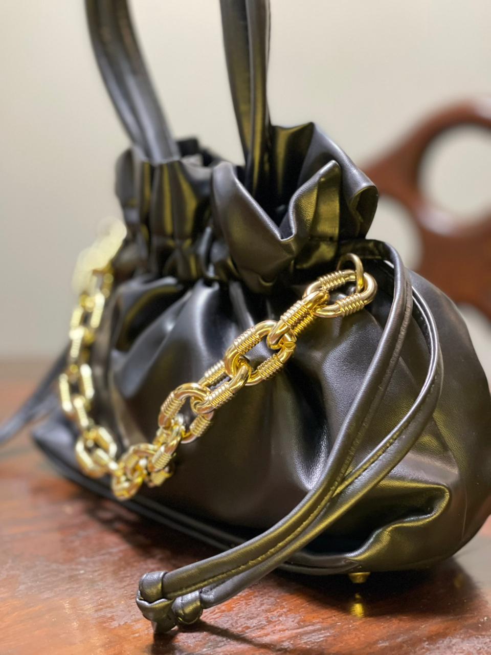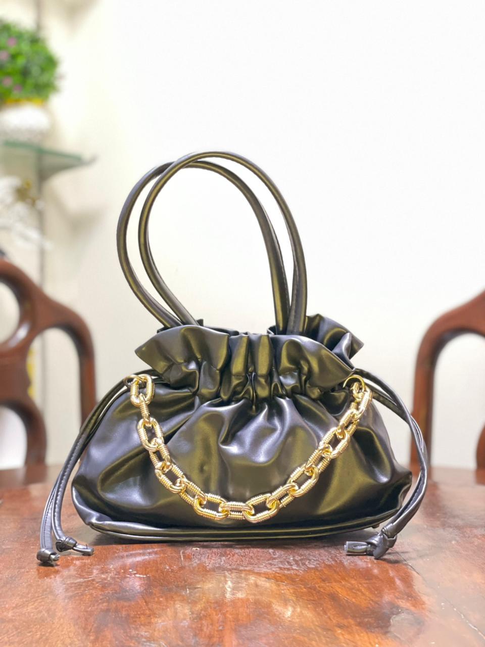 A standout gold-tone chain accent adds a touch of modern glamour, elevating the bag’s minimalist design with subtle shine. The comfortable top handle allows for easy hand or shoulder carry, making it a practical yet stylish companion for everyday wear.